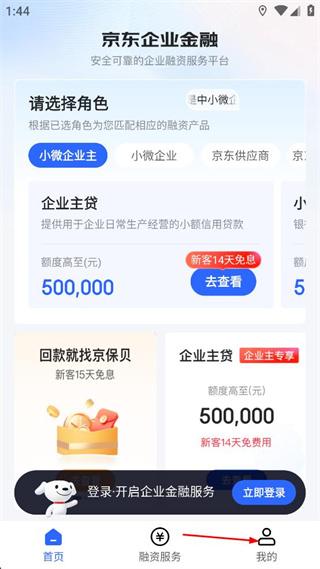1、进入京东企业金融首页,找到底部导航栏的我的选项,点击该选项进入个人页面。