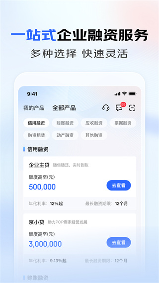 京东金融企业版是京东金融出品的,致力于通过科技创新能力,搭建一个针对于中小微企业的高效、安全、开放的移动企业综合服务平台。