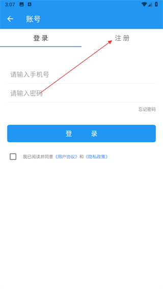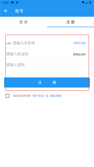 4、在注册界面,依次输入手机号、获取并填写验证码、设置密码,点击注册。