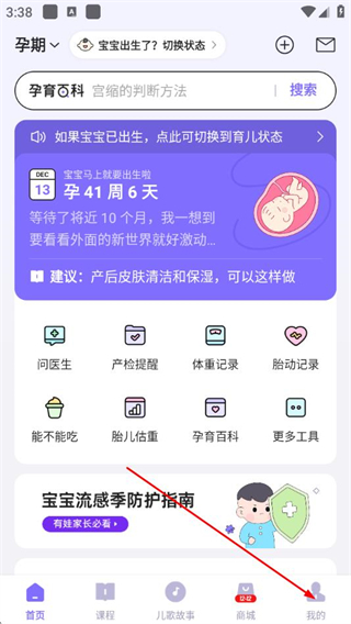 2、在个人中心页面点击孕41周区域,进入孕育状态管理页面。