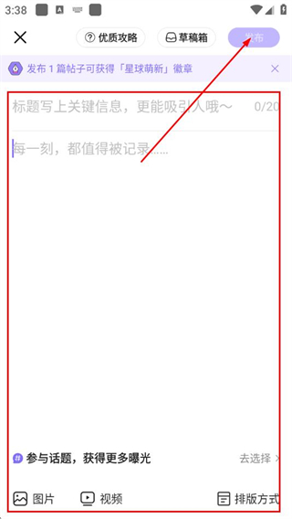 3、填写帖子标题、正文内容,可按需添加图片或视频,选择相关话题后点击发布。