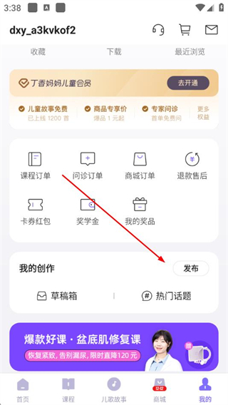 2、在个人中心页面的我的创作区域,点击发布,进入帖子编辑页面。