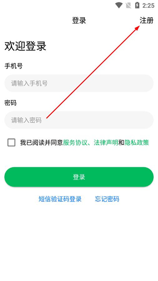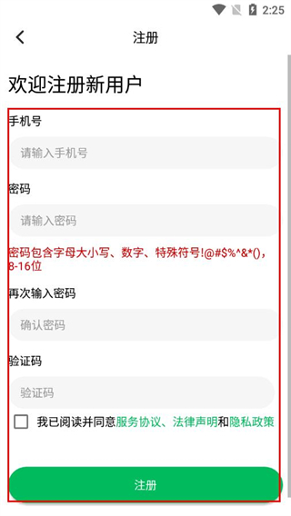 3、填写手机号、设置密码、获取并填写验证码,勾选同意协议后点击注册。