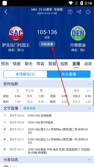 3、在比赛详情页中,点击动画直播,即可查看该场比赛的回放内容。