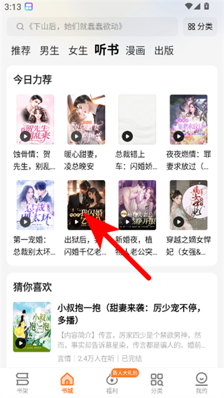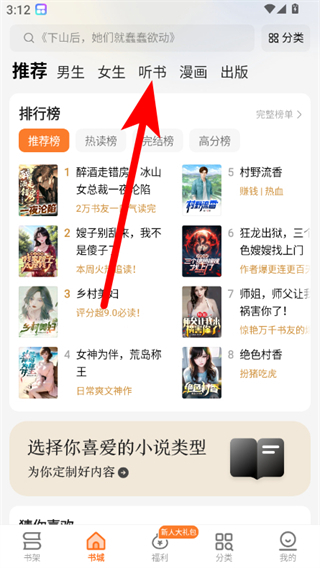 1、在秘读小说书城页面,点击听书选项,进入听书内容界面。
