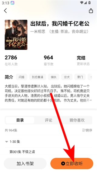 3、在书籍详情页面,点击立即收听按钮,进入音频播放界面。
