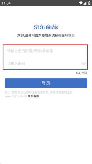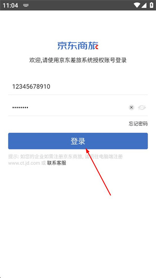 3、将账号和密码信息填写完成后,点击界面中的登录按钮完成京东商旅的登录操作。