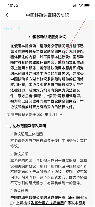 3、在协议详情页面即可查看中国移动认证服务协议的具体内容。