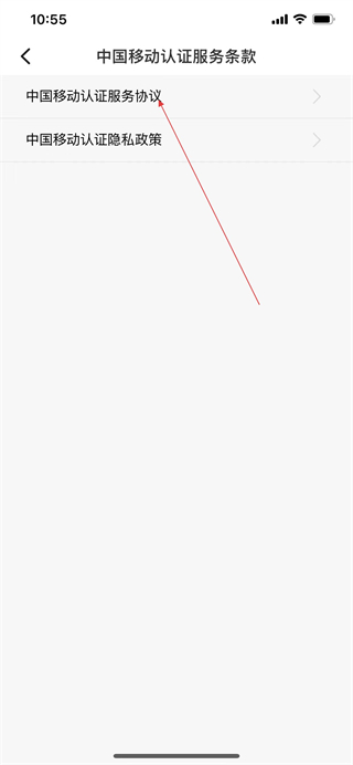 2、在条款页面点击中国移动认证服务协议选项,进入协议详情页面。