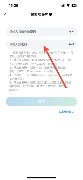 5、在修改登录密码页面,依次输入当前登录密码、符合规则的新密码,点击提交完成密码修改。