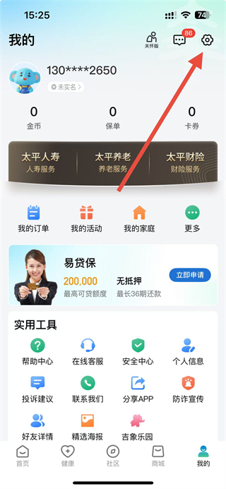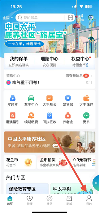 1、打开太平通APP后,找到页面底部我的选项并点击,进入我的界面。