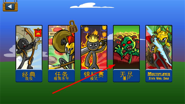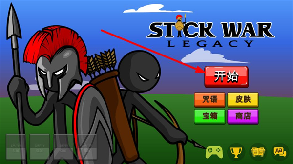 1、在火柴人战争遗产主界面,点击开始按钮,进入游戏模式选择页面。