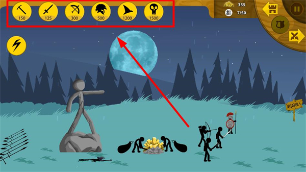 3、在战斗界面顶部,通过消耗资源解锁矿工、剑士、弓箭手等兵种单位。