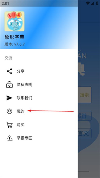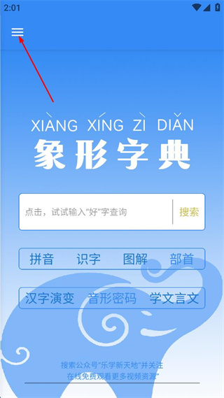 1、打开象形字典软件,进入主界面查看功能选项,点击左上角菜单按钮展开侧边栏。