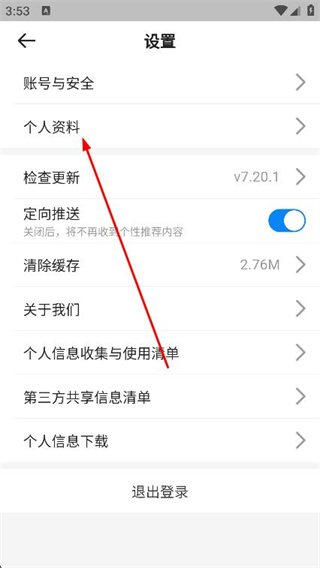 3、在设置页面,找到并点击上方的个人资料。