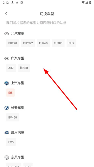4、在切换车型界面,选择对应汽车品牌下的具体车型,系统会匹配该车型对应的可签约站点信息供查看。