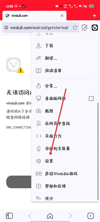 1、打开Vivaldi浏览器,点击界面右上角的Vivaldi图标,弹出功能菜单。