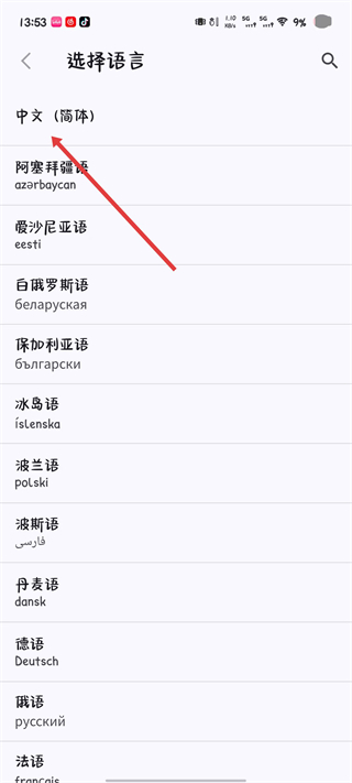 4、进入语言设置界面之后,选择当前设备所用语言,进入选择语言的界面。