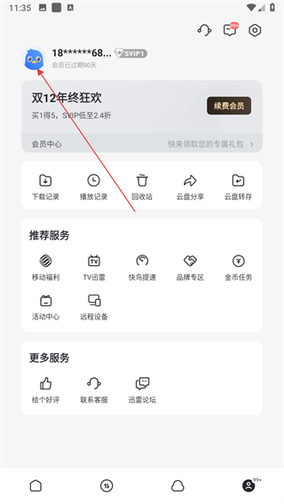 1、打开迅雷进入个人中心页面,点击账号名称左侧的头像区域。