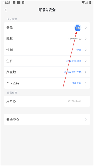 2、找到头像选项,点击该选项,跳转至账号与安全相关的设置页面。