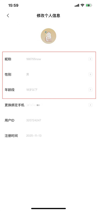 3、在修改个人信息页面,可对昵称、性别、年龄段等信息进行编辑调整。
