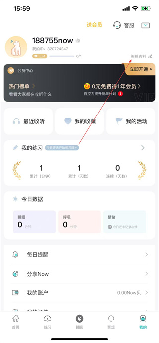 1、打开Now冥想app首页,点击底部导航栏的我的,进入个人中心页面。