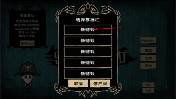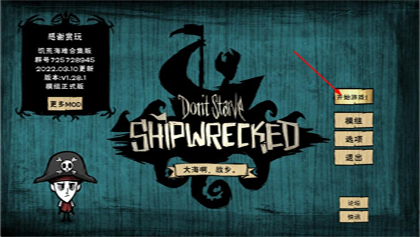 1、打开饥荒海难游戏,在主界面找到开始游戏按钮,点击该按钮弹出选择存档栏窗口。
