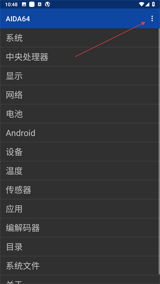 1、打开AIDA64应用进入主界面,点击界面右上角的三点样式菜单按钮。
