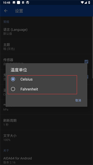 4、在温度单位弹窗中选择需要切换的单位,完成选择后即可完成温度单位的更改。