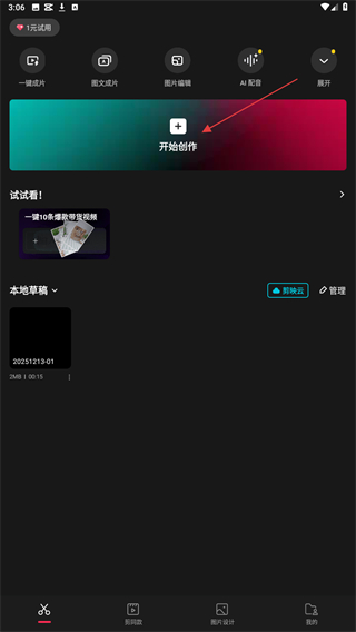 1、启动剪映的APP后,点击界面的开始创作按钮。
