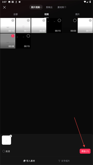 2、进入视频选择的界面内,选择并点击右下角添加的按钮。