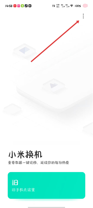 1、打开小米换机应用主界面,找到右上角三点样式的菜单图标,点击该图标。