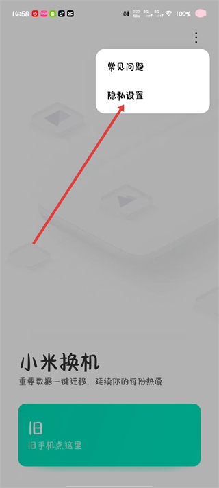 2、在展开的菜单选项中选择隐私设置,点击后进入小米换机的隐私设置页面。