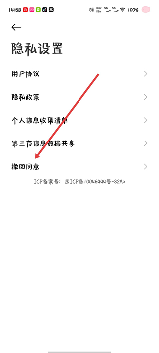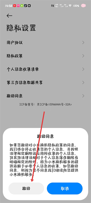 3、在隐私设置页面里找到撤回同意选项,点击该选项弹出撤回确认的提示弹窗。