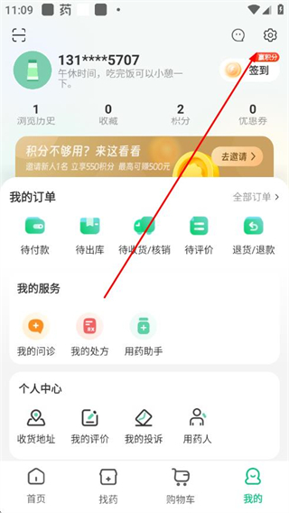 1、在药房网商城App首页点击底部的我的选项,进入个人中心页面。