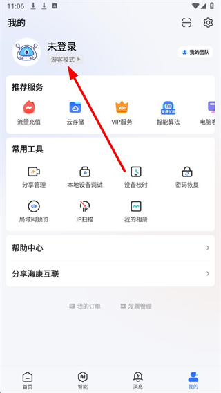 1、在海康互联app首页点击团队名称区域,进入我的团队页面。