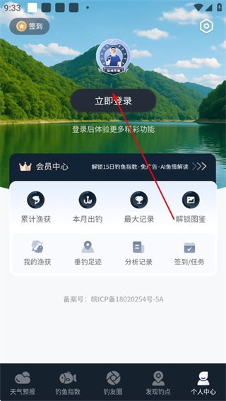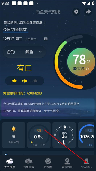 1、打开钓鱼天气预报app,点击底部个人中心选项,进入个人中心页面。