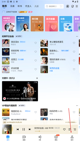 1、在酷狗首页点击底部导航栏的我的,进入个人中心页面。
