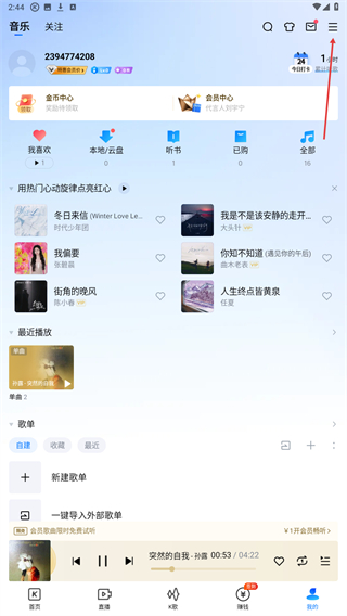 2、在该界面的右上角区域,点击更多功能菜单按钮,进入酷狗的功能设置页面。