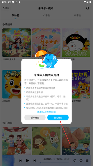 4、在未成年人模式的确认弹窗里,点击确定开启按钮,即可完成未成年人模式的开启。