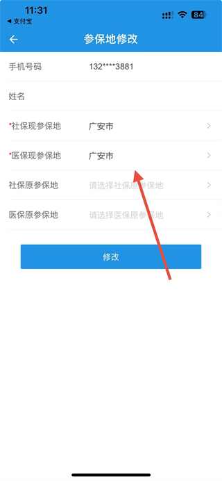 3、在参保地修改页面,选择参保地,完成后点击修改按钮,完成参保地址的修改操作。