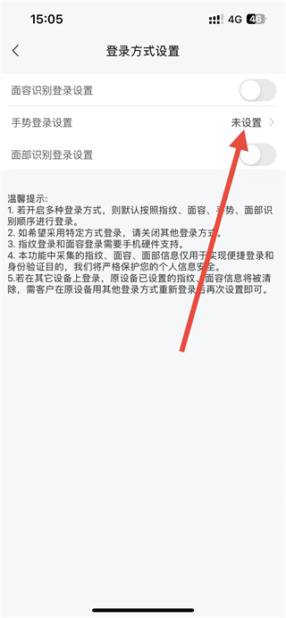 3、在登录方式设置页面,找到手势登录设置选项并点击,进入手势登录的配置页面。