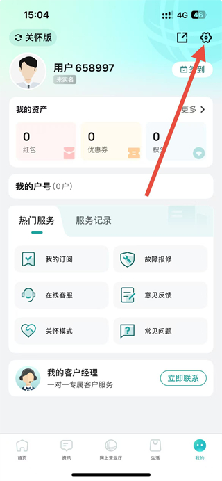 1、打开国家电网APP,在我的页面右上角找到设置图标并点击,进入设置界面。