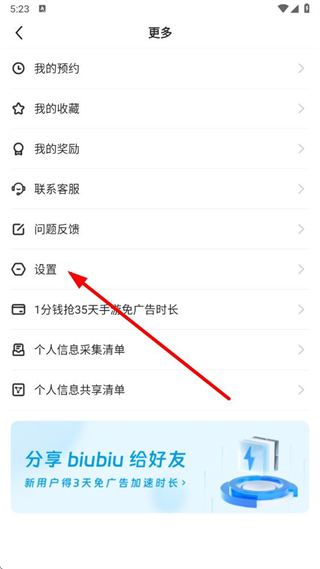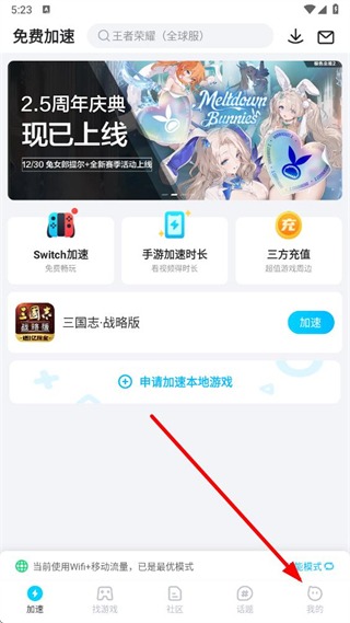 1、在biubiu加速器主界面,点击底部导航栏我的选项,进入个人功能页面。