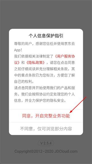 1、打开京东云后,阅读弹出的个人信息保护指引内容,点击同意开启完整业务功能按钮。