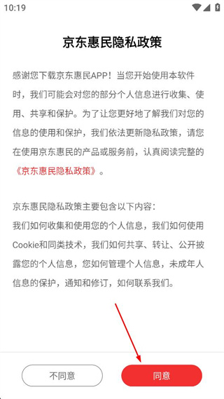 1、打开京东惠民APP后,阅读呈现的京东惠民隐私政策内容,确认后点击页面中的同意按钮。