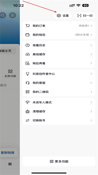 3、在菜单栏中找到设置选项并点击,进入抖音的设置界面。