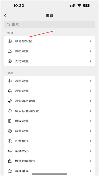 4、在设置页面里,点击账号与安全的选项,进入账号配置界面。