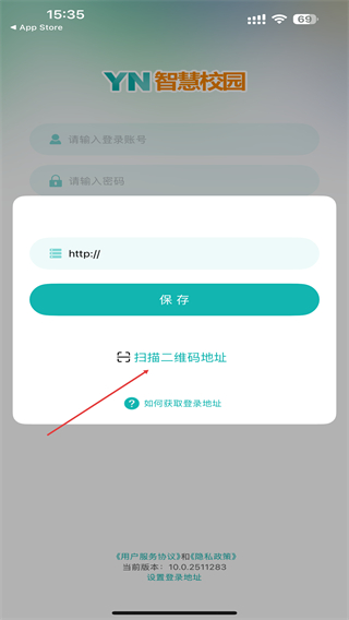 1、启动yn智慧校园App,进入时点击扫描二维码地址。