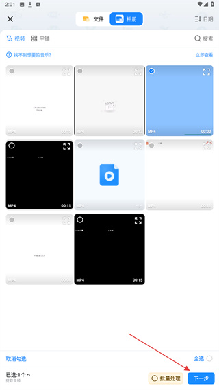 2、在弹出的相册界面中,勾选需要提取的音频,选好后点击下一步。